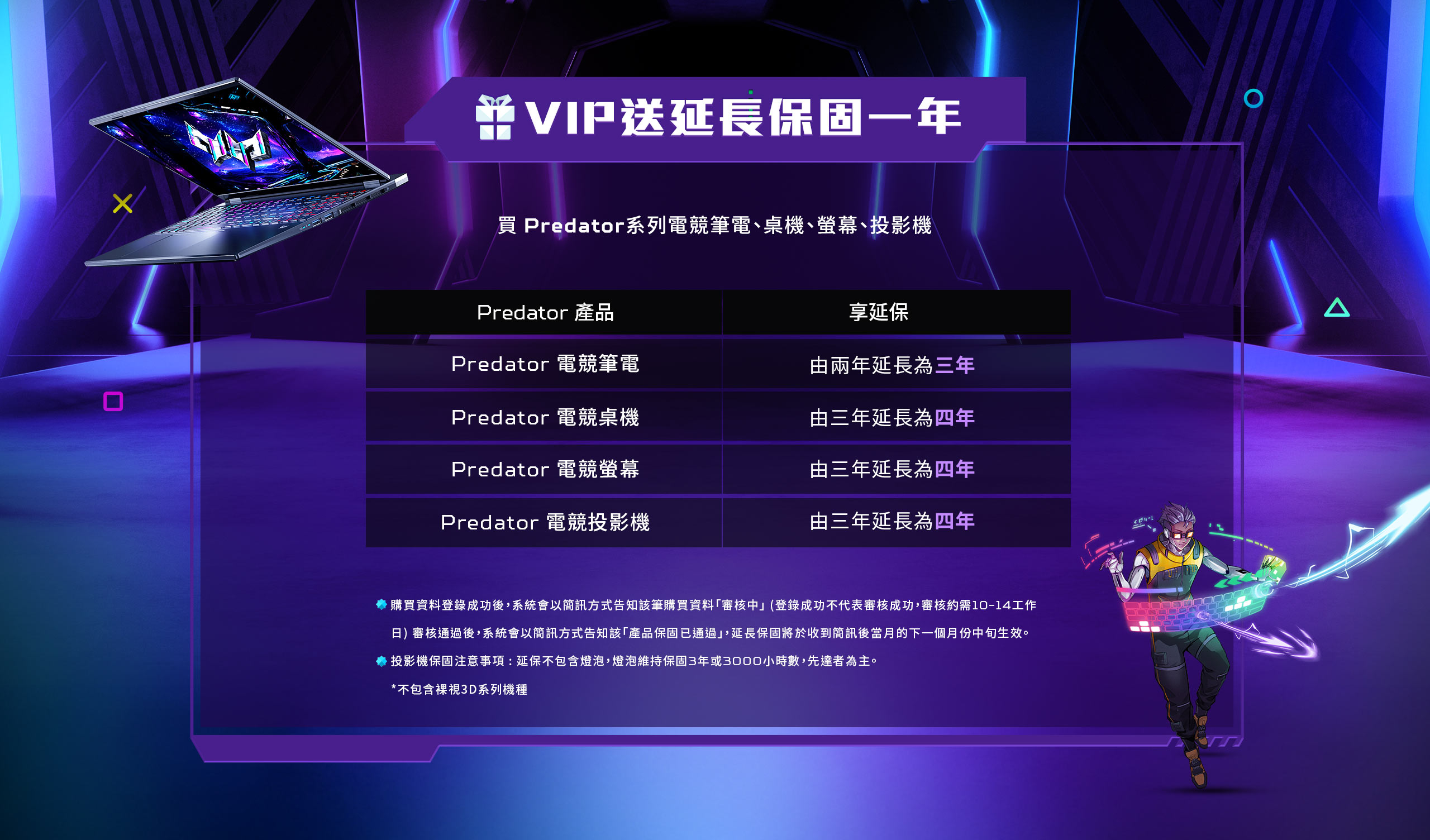 - 本活動適用於Predator全系列筆電、主機、螢幕、投影機產品。