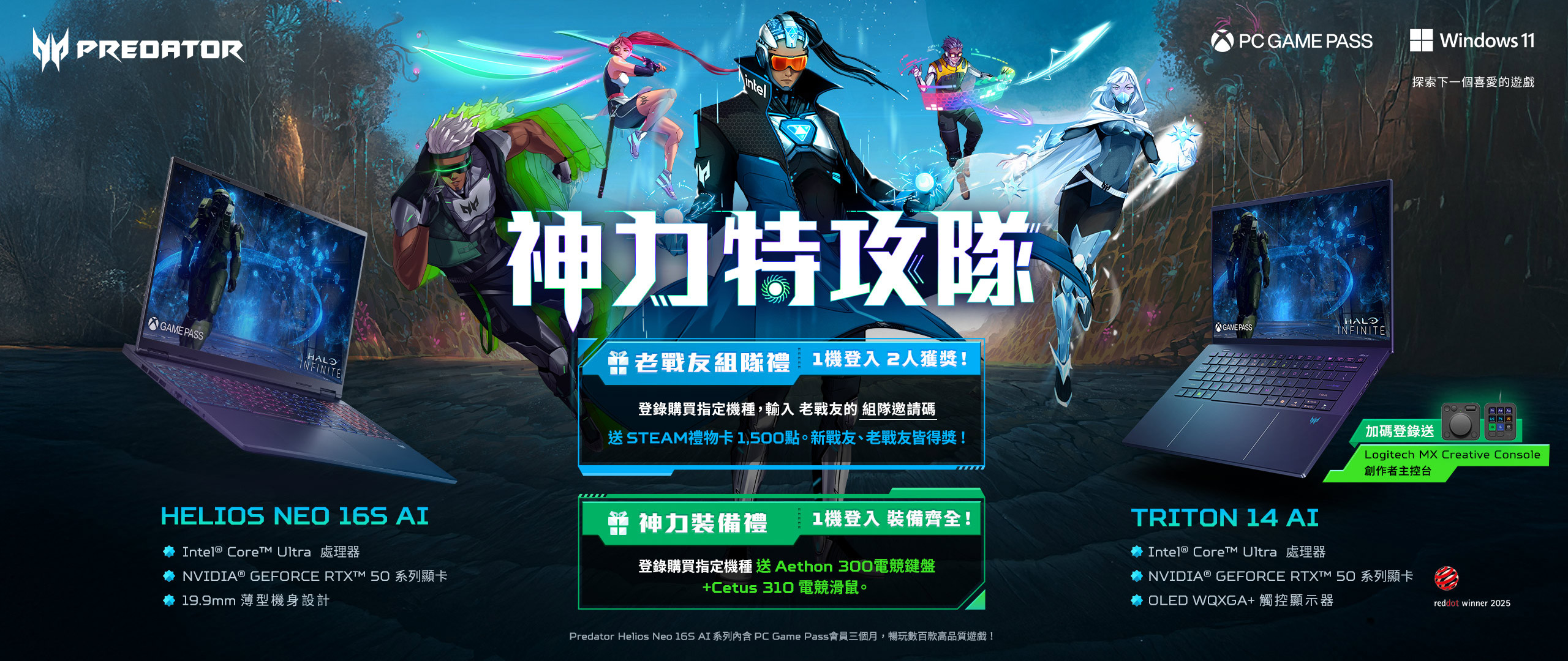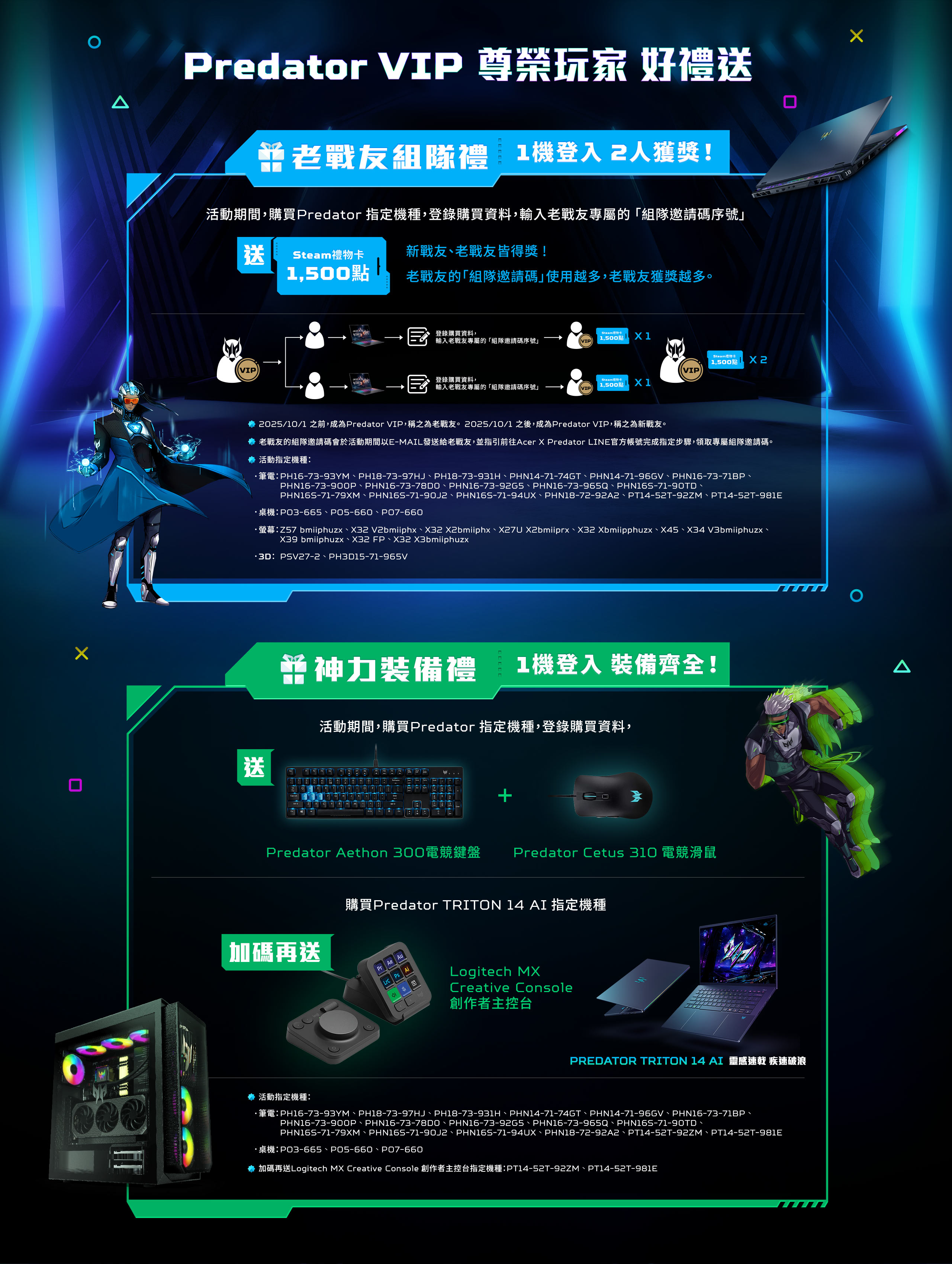 - 2025/10/1(三)-2025/12/31(三),購買Predator 指定機種,登錄購買資料,輸入老戰友專屬的 「組隊邀請碼序號」,送 Steam 禮物卡1500點。新戰友、老戰友皆得獎 !