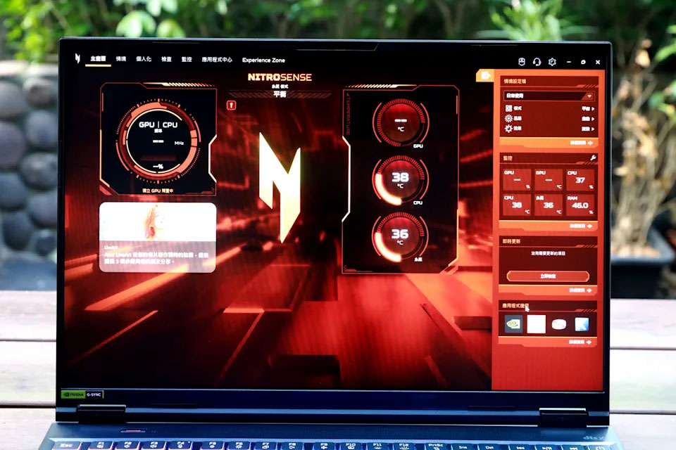 Nitro 16S AI 內建獨家「NitroSense」應用程式,當玩家按下「NitroSense」專屬鍵後會進入系統監控介面,包含系統運作監控、顯示情境模式、背光等功能設定一目瞭然。
