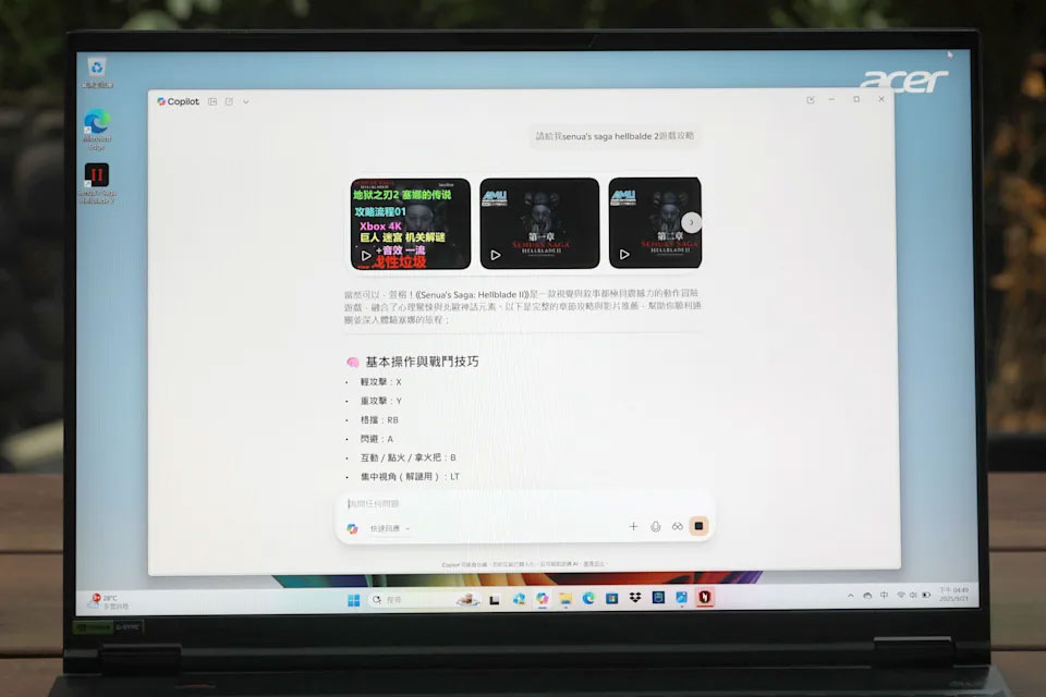 專為 AI 電競新世代打造的 Nitro 16S AI 電競筆電支援 Windows 11 及「Microsoft Copilot」AI小幫手,只要按下 Copilot 專用鍵即可啟動 AI 作業支援,使 Copilot 能夠無縫地融入你的日常工作,像是遊戲卡關只要請 Copilot 提供遊戲攻略,就能獲得馬上解答。