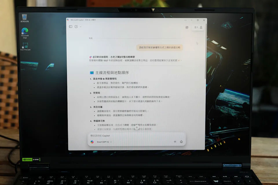 專為 AI 新世代打造的 Helios Neo 16 AI電競筆電支援「Microsoft Copilot」AI小幫手,只要按下 Copilot 專用鍵即可啟動AI作業支援,使 Copilot 能夠無縫地融入你的日常工作,像是《印第安那瓊斯》遊戲卡關了,沒關係,只要輕鬆問一句馬上幫你送上遊戲攻略。